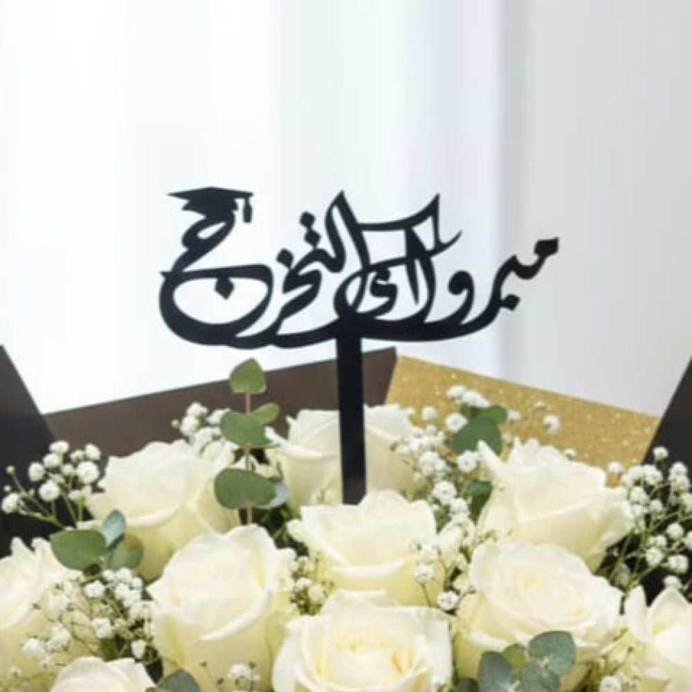 أضف لمسة عصرية وفنية لاحتفال تخرجك مع تغريسة باقات الورد والكيك هذه! تتميز هذه التغريسة بتصميم فريد لعبارة "مبروك التخرج" مكتوبة بأسلوب الخط العربي الحر الأنيق، مع دمج فني لقبعة التخرج ضمن الكلمات.