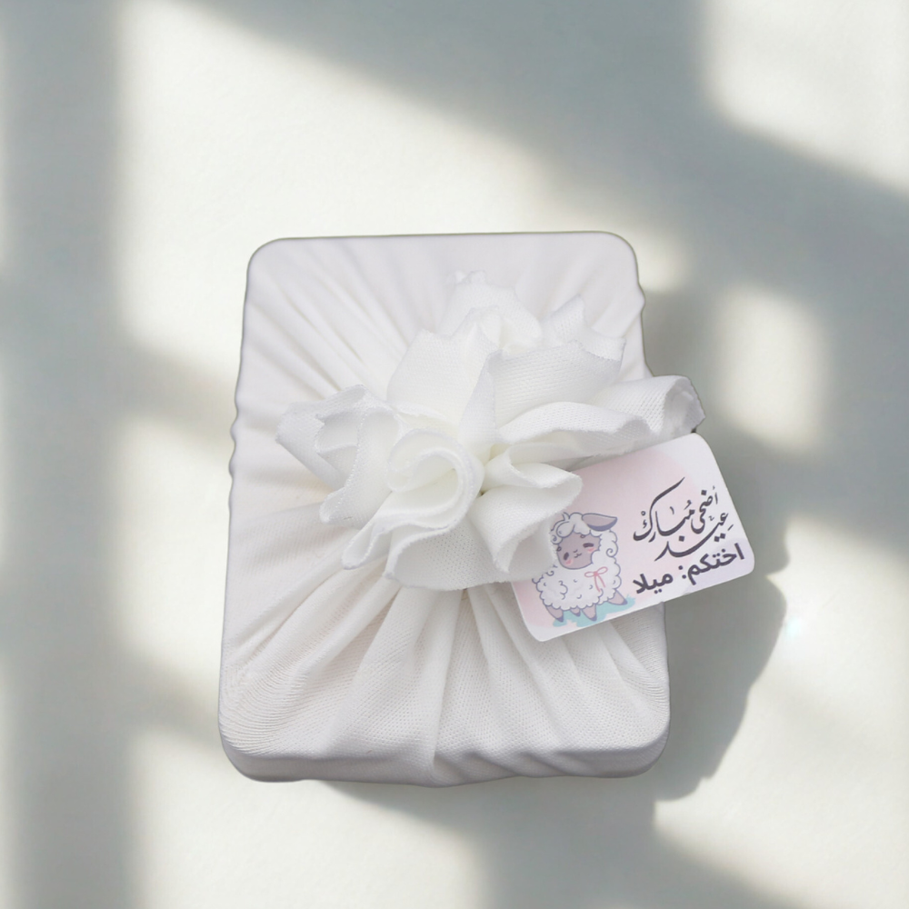 - التغليف: كل قطعة مغلفة بشكل فردي وأنيق بقماش حريري أبيض (أو ما شابه)، مزينة بفيونكة رقيقة وملصق خاص بتهنئة عيد الأضحى.