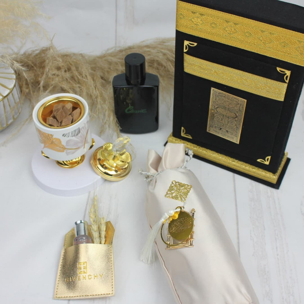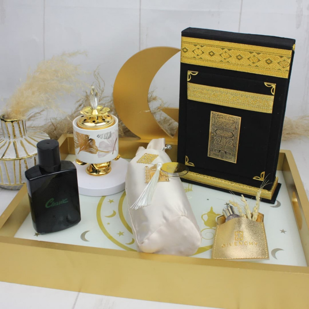 مع عطر بلاك كلاسيك الفاخر. كما يضم مبخرة أنيقة مع بخور كمبودي لنشر عبق الراحة، بالإضافة إلى سجادة صلاة، مصحف، ومسك رمان مع غلاف جلد جيب، مما يجعله هدية مثالية للشهر الكريم.