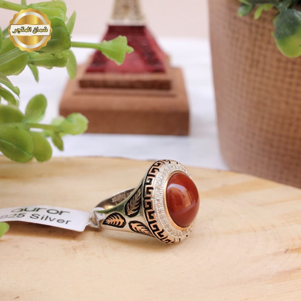خاتم فضه بحجر عقيقي كبدي دائري مع زركون