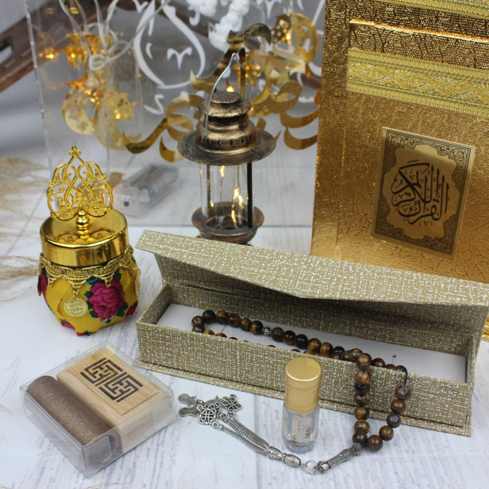 - مصحف مقاس ربع (14X20 CM) مغلف بلون ذهبي.