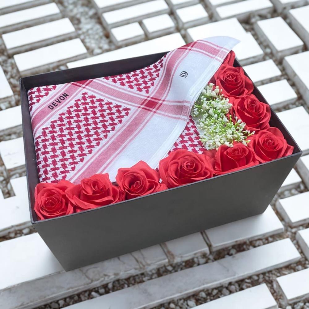 تتكون الهدية من شماغ أحمر فاخر، يتميز بجودته العالية وتصميمه العصري، محاط بترتيب جميل من الورود الحمراء الطبيعية التي تضفي عليها طابعًا رومانسيًا.