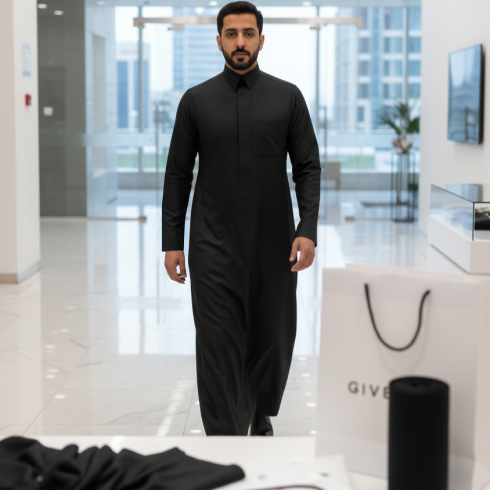 • جودة ماركة عالمية: قماش أصلي من ماركة جفنشي العالمية، يضمن ثبات اللون ومقاومة التجعد ليظل الثوب أنيقاً بعد كل غسلة.