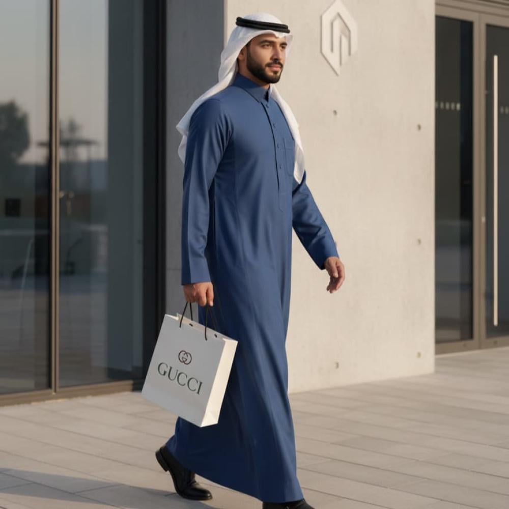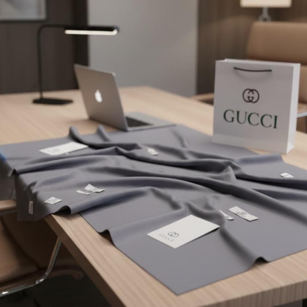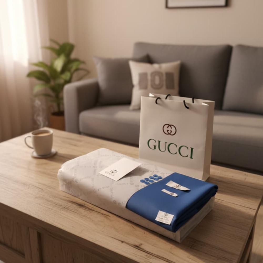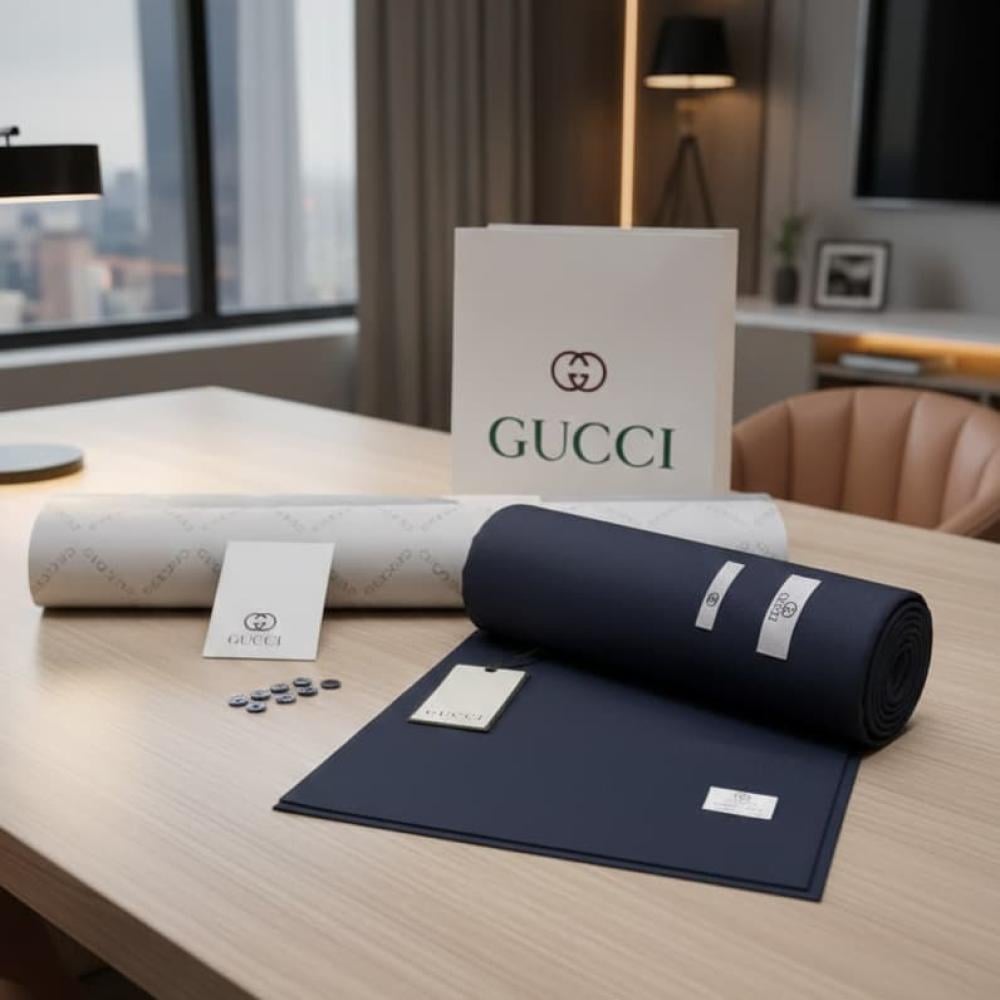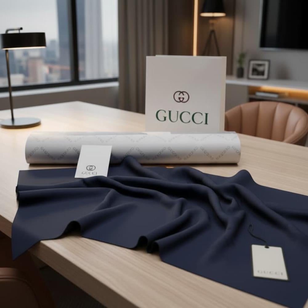 - ملحقات متكاملة: يأتي القماش مع كافة ملحقات البراند (8 أزرار محفورة بشعار قوتشي + شعار الجيب والرقبة) لضمان اكتمال فخامة الثوب.