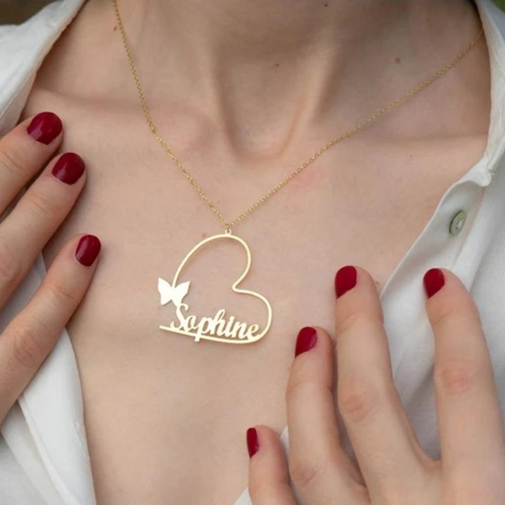 - التصميم: قلب مفتوح يضم اسم مخصص بخط أنيق، ترافقه فراشة رقيقة على إحدى حواف القلب.