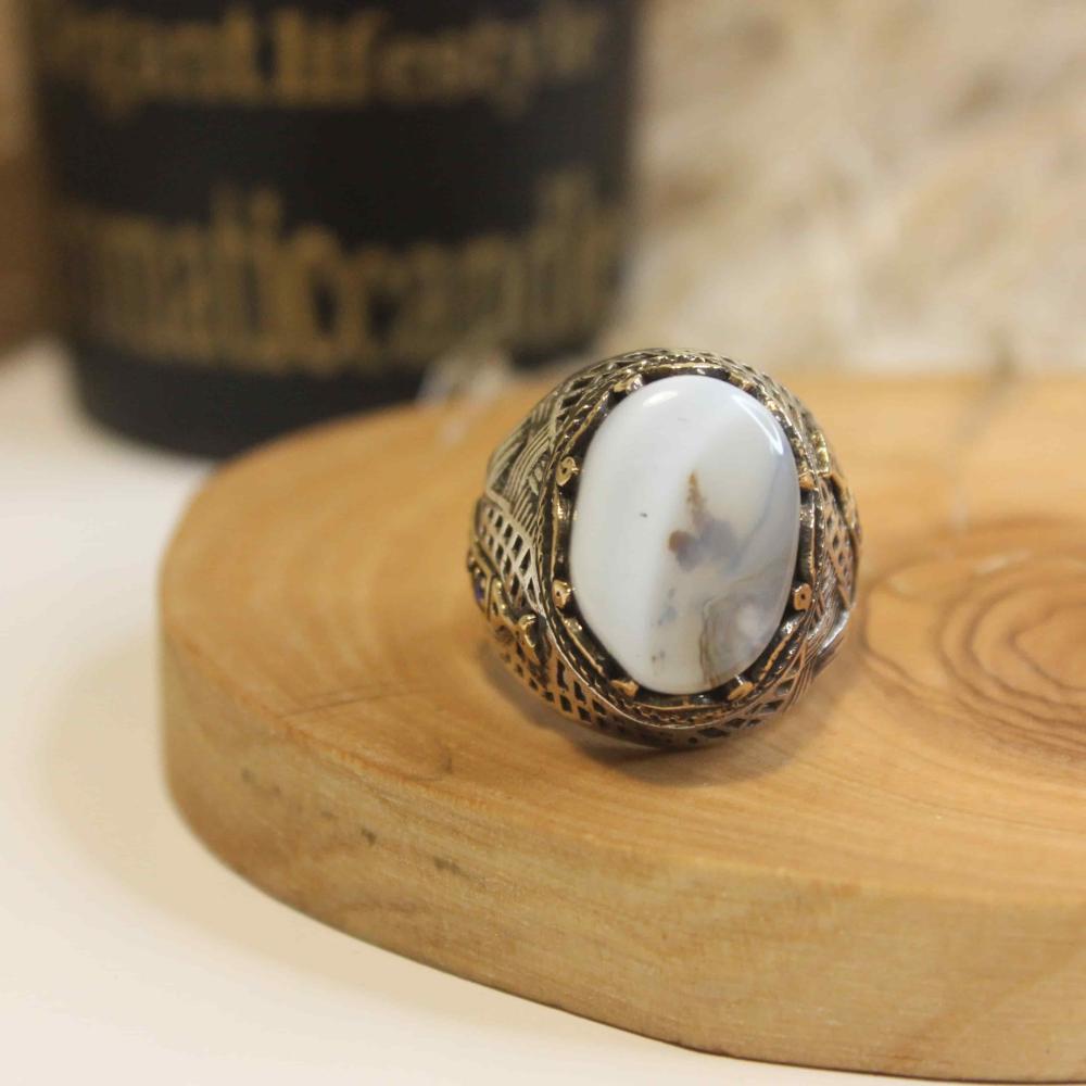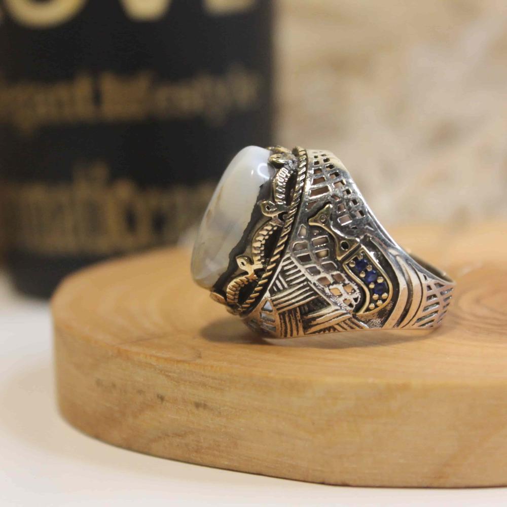 - حجر مركزي طبيعي: يزين الخاتم حجر العقيق الأبيض الطبيعي، المعروف بجماله الهادئ ولمعانه الفريد، مما يجعله من أجمل أشكال الخواتم الرجالية.